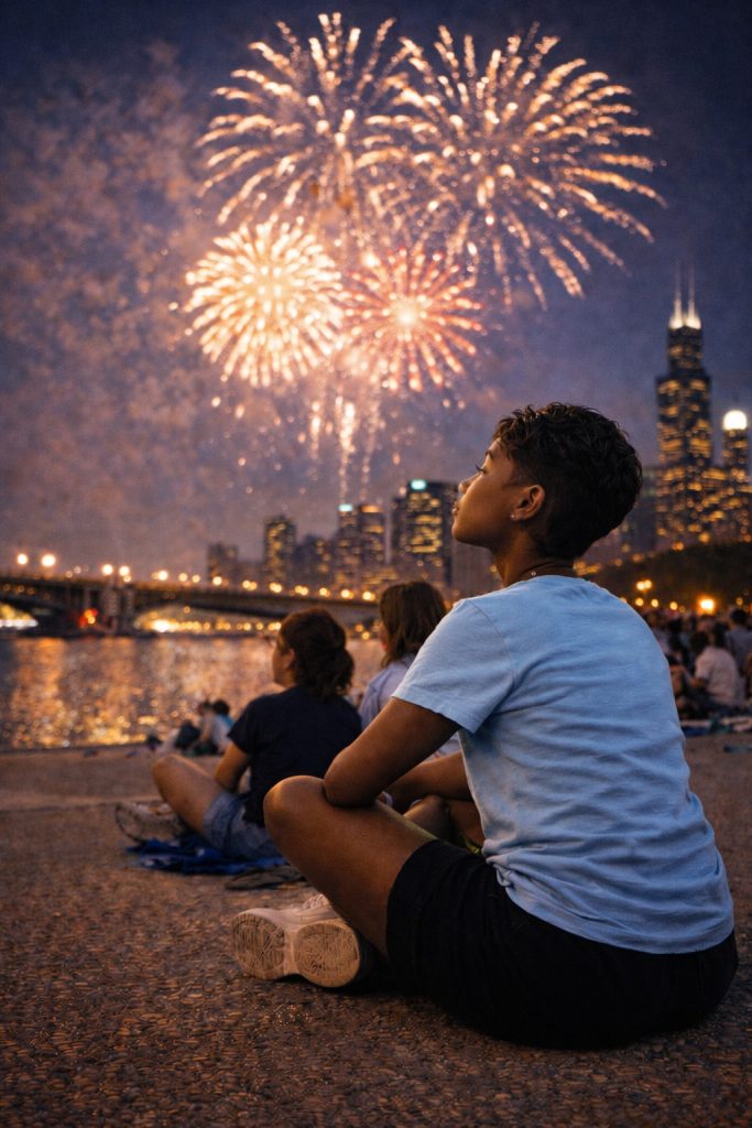 On the Fourth of July, our group went to Grant Park to watch the fireworks. A major street running through the park had been closed to traffic for the celebration, and thousands of people gathered there. I remember sitting right in the middle of that street, a place where cars normally passed all day long, watching the fireworks light up the Chicago skyline.